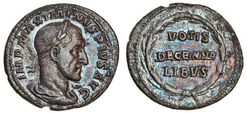 Maximinus I (AD 235-238), AR Denarius, 235, laureate, draped and cuirassed bust right, rev. VOTIS / DECENNA / LIBVS within laurel-wreath (RIC 17; BMC 38; RSC 117), dark tone, good very fine, very rare