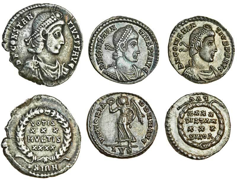 Constantius II (AD 337-361), AR Siliqua, Lugdunum, pearl-diademed, draped and cuirassed bust right, rev. VICTORIA DD NN AVG, Victory standing left, holding wreath and palm-branch, LVG in exergue (RIC 214; RSC 259a), toned, about extremely fine, another similar but rev. VOTIS / XXX / MVLTIS / XXXX in wreath, LVG in exergue (RIC 216; RSC342-3a), toned, extremely fine, and a heavy Siliqua, Sirmium, as last but .SIRM in exergue (RIC 17; RSC 342-3f), very fine (3)