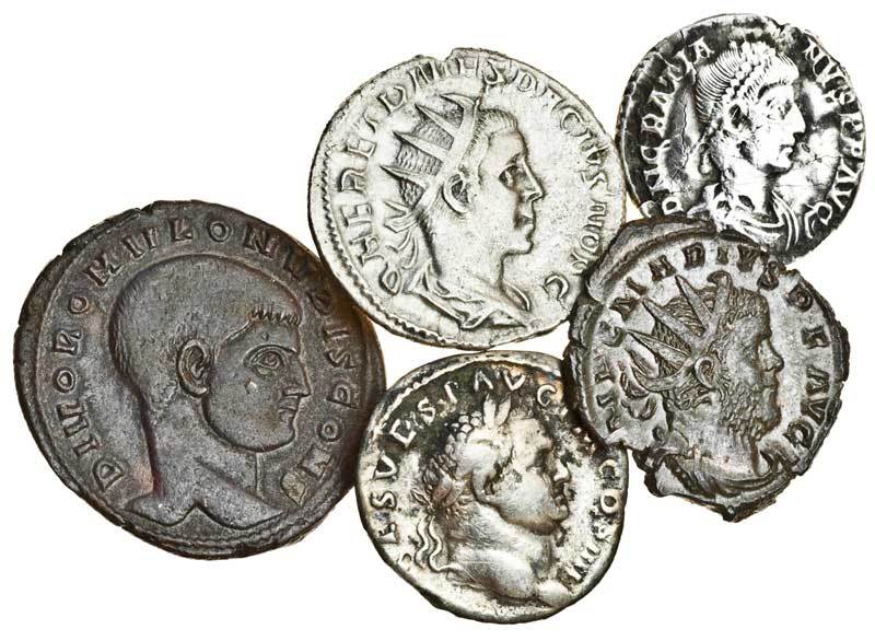 Miscellaneous Roman, Vespasian, Denarius, rev. priestly implements (RIC 42), Gratian, Siliqua, Aquileia mint, rev. Roma seated facing (RSC 56†d), Herennius Etruscus, Antoninianus, rev. Apollo seated left (RIC 24a), good fine or better; Marius (AD 269), Antoninianus, Cologne, radiate, draped and cuirassed bust right, rev. CONCORDIA MILITVM, clasped right hands (RIC 7; C. 4), scarce, flan a little ragged, extremely fine, Divus Romulus, son of Maxentius, Follis, Ostia, 309-312, bare head right, DIVO ROMVLO N V BIS CONS, rev. AETERNAE MEMORIAE, eagle atop domed shrine, MOSTS in exergue (RIC 34), very fine (5)