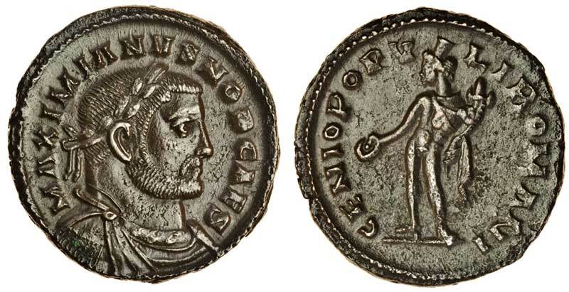 Galerius as Caesar (AD 293-305), AE Nummus (27.3 x 27.7 mm 9.73 g 6h), London mint c. AD 303-305, MAXIMIANVS NOB CAES, laureate, draped and cuirassed bust of Galerius right, rev. GENIO POPVLI ROMANI, Genius standing left holding patera and cornucopia (RIC 36; CT 3.01.034), extremely fine