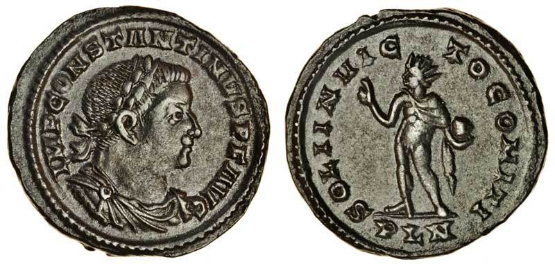 Constantine the Great (AD 307-337), AE Nummus (24.3 x 23.0 mm 4.91 g 6h), London mint, IMP CONSTANTINVS PF AVG, laureate, draped and cuirassed bust of Constantine right, rev. SOLI INVICTO COMITI, Sol standing left. PLN in exergue (RIC 114; CT 6.01.004), extremely fine