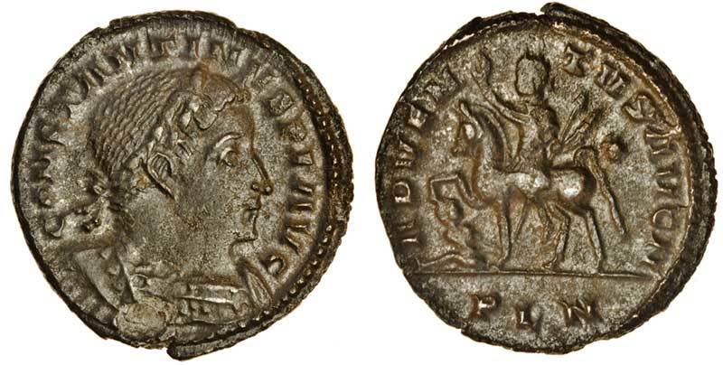 Constantine the Great (AD 307-337), AE Nummus (22.9 x 23.4 mm 4.34 g 6h), London mint, CONSTANTINVS PF AVG, laureate, cuirassed bust of Constantine right, rev. ADVENTVS AVG N, Emperor riding left, right hand raised, left holding up spear, on horse pawing seated captive to left, star in right field, PLN in exergue (RIC 142; Huvelin 14; CT 7.01.020 (this coin)), about extremely fine