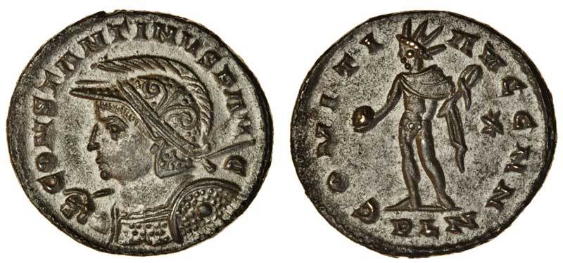 Constantine the Great (AD 307-337), AE Nummus (23.3 x 21.4 mm 4.55 g 6h), London mint, CONSTANTINVS P AVG, helmeted and decorated with a plain band rather than a laurel wreath, cuirassed bust of Constantine left, spear over right shoulder and shield on left, rev. COMITI AVG NN, Sol standing left, star in right field, PLN in exergue (RIC 177 var.; Huvelin 51 var.; CT 7.03.036 var.), extremely fine