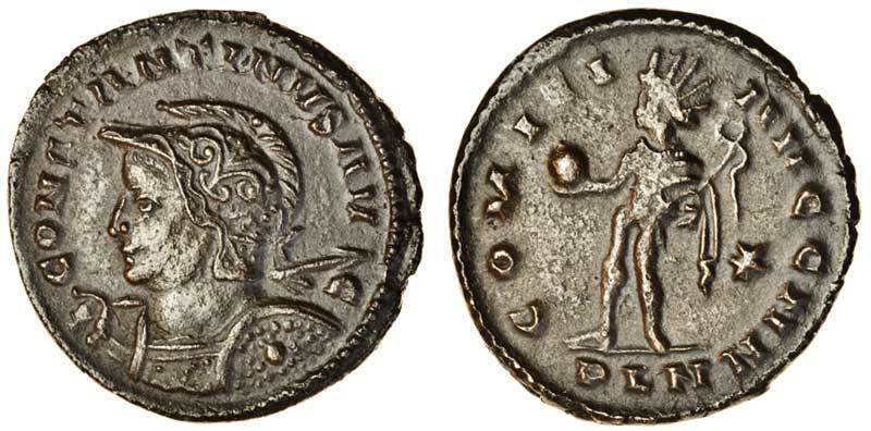 Constantine the Great (AD 307-337), AE Nummus (22.9 x 22.7 mm 4.25 g 7h), London mint, CONSTANTINVS AVG, helmeted, cuirassed bust of Constantine left, spear over right shoulder and shield on left, rev. COMITI AVG NN, Sol standing left, star in right field, PLN in exergue (RIC 184; Huvelin 60-60a; CT 7.03.048 (this coin), good very fine.