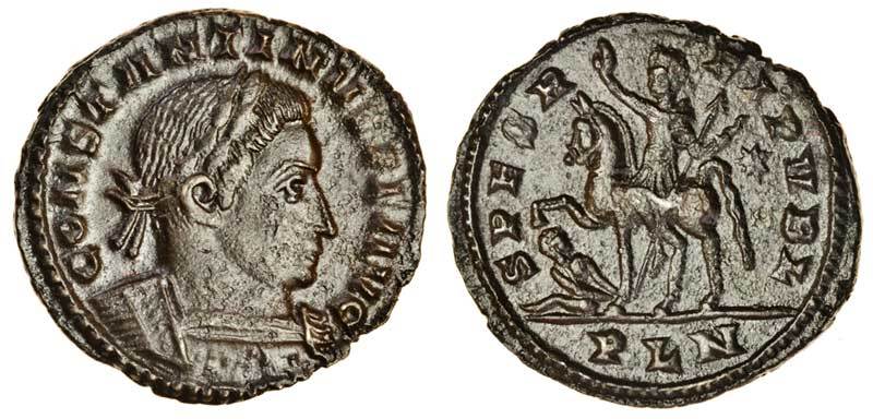 Constantine the Great (AD 307-337), AE Nummus (23.3 x 22.3 mm 4.26 g 6h), London mint, CONSTANTINVS PF AVG, laureate, cuirassed bust of Constantine right, rev. SPES REIPVBL, Emperor riding left, right hand raised, left holding up spear, on horse pawing seated captive to left, star in right field, PLN in exergue (RIC 241; Huvelin 155; CT 7.08.014 (this coin)), extremely fine