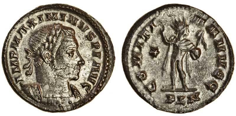 The COMITI issues with the left star mintmark are all very rare. The four known COMITI AAVVGG coins for this mintmark listed in CT (two for Maximinus and one each for Constantine and Licinius) are all struck from the same reverse die. It is most likely that a single reverse die was engraved with this mintmark and reverse type.