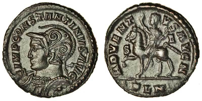 Constantine the Great (AD 307-337), AE Nummus (20.7 x 20.5 mm 2.79 g 6h), London mint, IMP CONSTANTINVS AVG, helmeted, cuirassed bust of Constantine left, spear over right shoulder, left holding shield, rev. ADVENTVS AVG N, Emperor mounted left, raising right hand, left holding spear, S and F in fields, PLN in exergue (RIC 2; CT 8.02.002 (this coin), extremely fine