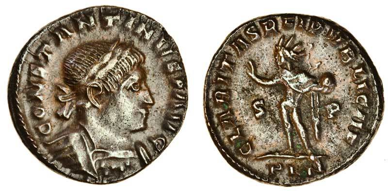 Constantine the Great (AD 307-337), AE Nummus (18.9 x 18.7 mm 3.34 g 7h), London mint, CONSTANTINVS P AVG, laureate, cuirassed bust of Constantine right, rev. CLARITAS REPVBLICAE, Sol standing left S and P in fields, PLN in exergue (RIC 102; CT 8.09.003 (this coin)), good very fine