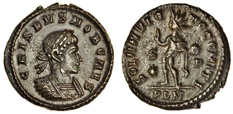 Crispus as Caesar (AD 317-326), AE Nummus (20.6 x 20.1 mm 3.04 g 7h), London mint, CRISPVS NOB CAES, laureate, cuirassed bust of Crispus right, rev. SOLI INVICTO COMITI, Sol standing left, S above star and P in fields, PLN in exergue (RIC 122; CT 8.10.010 (this coin)), about extremely fine.