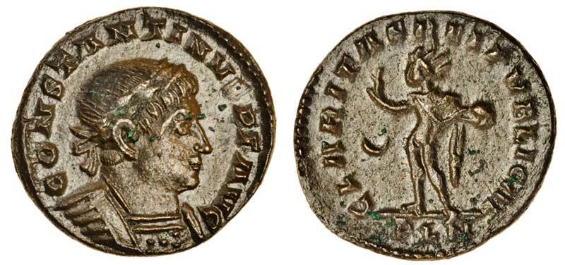 Constantine the Great (AD 307-337), AE Nummus (19.5 x 18.3 mm 3.09 g 7h), London mint, CONSTANTINVS P F AVG, laureate, cuirassed bust of Constantine right, rev. CLARITAS REPVBLICAE, Sol standing left, crescent in left field, PLN in exergue (RIC 125; CT 8.11.002 (this coin)), extremely fine