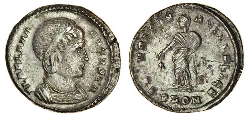 The coins of Helena were only struck for a short time at London because the mint was closed soon after Helena was elevated to the rank of Augusta. This coin is illustrated on the CT plate.