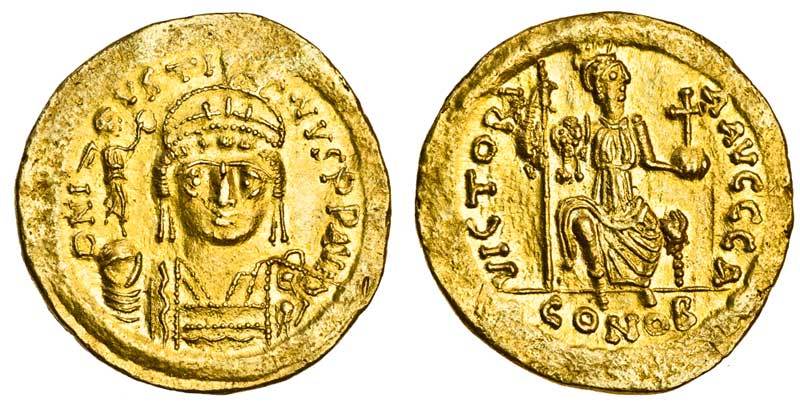 Justinian II (565-578), Solidus, 4.45g, helmeted and cuirassed beardless bust facing, holding globe surmounted by Victory, rev. Constantinople seated, facing right, holding spear and globus cruciger, conob in exergue (DO 4; S.345), very fine