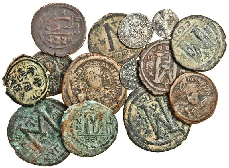 Byzantine Empire, AE Folles of Anastasius, Constantinople, facing bust (Sear 19), Justinian I, Con. (Sear 163), another similar, another, Nicomedia (Sear 201), another, Antioch, Justinian enthroned facing (Sear 214), another, facing bust (Sear 218), Justin II, Con., Justin and Sophia enthroned facing (Sear 360), another, Antioch (Sear 379), Maurice Tiberius, Con., facing bust holding mappa and sceptre (Sear 495), another, facing bust holding cross on globe (Sear 494), and another, Antioch (Sear 532), together with an AR Miliaresion of John I, circular medallion with facing bust of John I at centre of cross crosslet (Sear 1792), and two clipped miliaresia of Basil II (Sear 1810 and 1811), fine to about very fine (14)