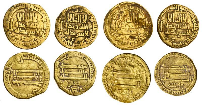 Abbasid, temp. al-Rashid (786-809), AV Dinars, (3) 3.85g, mintless type (Misr), AH175, Musa below reverse legend, 3.91g, mintless type (Misr), AH181, Ja'far below reverse legend, 3.99g, mintless type, AH188; Aghlabid, Muhammed I (840-56), AV Dinar, 4.13g, mintless type, AH209, rev. ghalib above legend, Muhammad below (Bernardi 51, 65, 69, 128; A.218.2, 218.7, 281.11, 443), the last a little bent but scarce, fine to good fine (4)