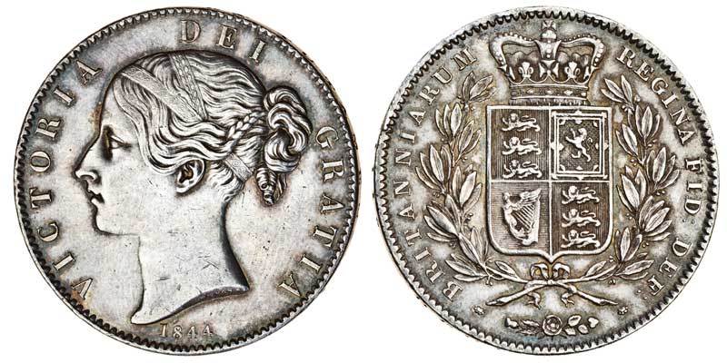 Victoria (1837-1901), Crown, 1844 viii with cinqufoil stops, young head left, rev. crowned shield (ESC 281; S.3882), good very fine, lightly toned
