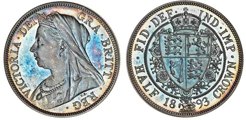 Victoria (1837-1901), proof Halfcrown, 1893, veiled bust left, rev. crowned shield in Garter, edge straight grained (ESC 727; S.3938), blue-grey tone with some spots on the brilliant surfaces, uncirculated
