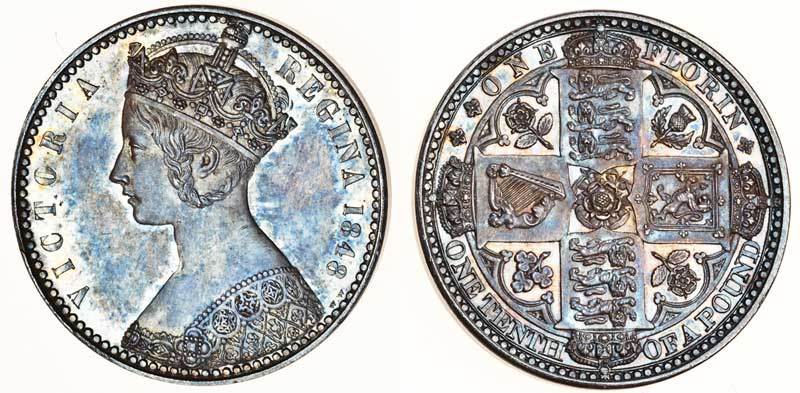 Victoria (1837-1901), proof pattern 'Godless' Florin, 1848, crowned Gothic bust left, 'Godless' type, rev. four crowned shields cruciform, plain edge (ESC 886; S.3890), deeply toned and lustrous, uncirculated, rare