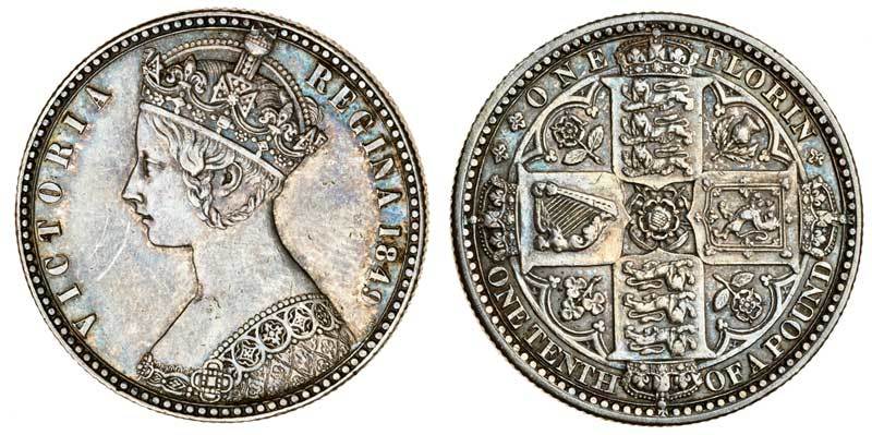 Victoria (1837-1901), 'Godless' Florin, 1849, crowned Gothic bust left, ww behind bust, rev. four crowned shields cruciform (ESC 802; S.3890), extremely fine, with lustre and old cabinet tone