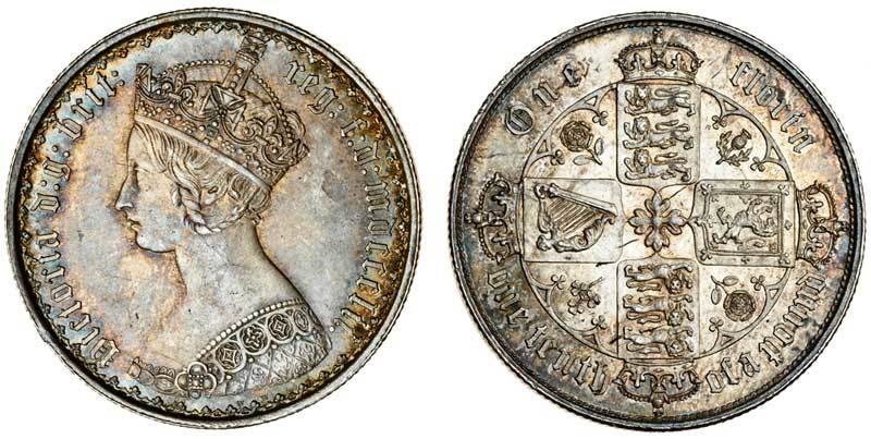 Victoria (1837-1901), Florin, 1852, crowned Gothic bust left, date in Roman numerals, rev. four crowned shields cruciform (ESC 806; S.3891), a few small marks otherwise extremely fine and lustrous