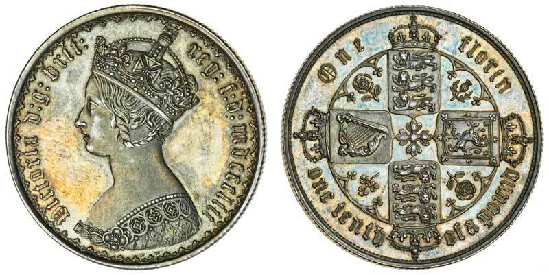 Victoria (1837-1901), proof Florin, 1853, crowned Gothic bust left, rev. four crowned shields cruciform, grained edge (ESC 809; S.3891), dark tone, one or two handling marks but about uncirculated, rare