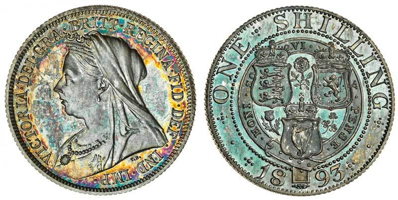 Victoria (1837-1901), proof Shilling, 1893, veiled bust left, rev. three shields in Garter (ESC 1362; MCE 1346; S.3940), the brilliant surfaces deeply toned, uncirculated