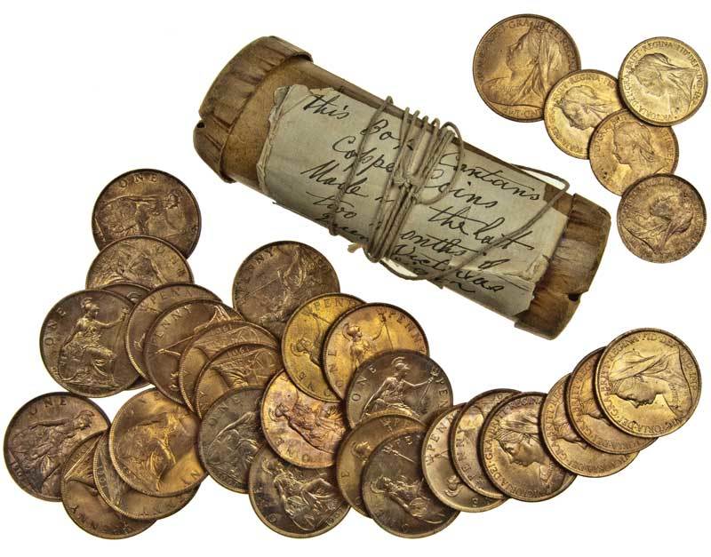 These coins were kept wrapped in a Sunlight Burners cardboard tube with a paper note stating 'This box contains Bronze or Copper Coins struck in the last two months of the reign of Her Majesty Queen Victoria deposited by John Reeves for Beatrice Mary Selina Lowe for a Birthday present in 1921. Dated this 13th day of March 1901. John Reeves' .