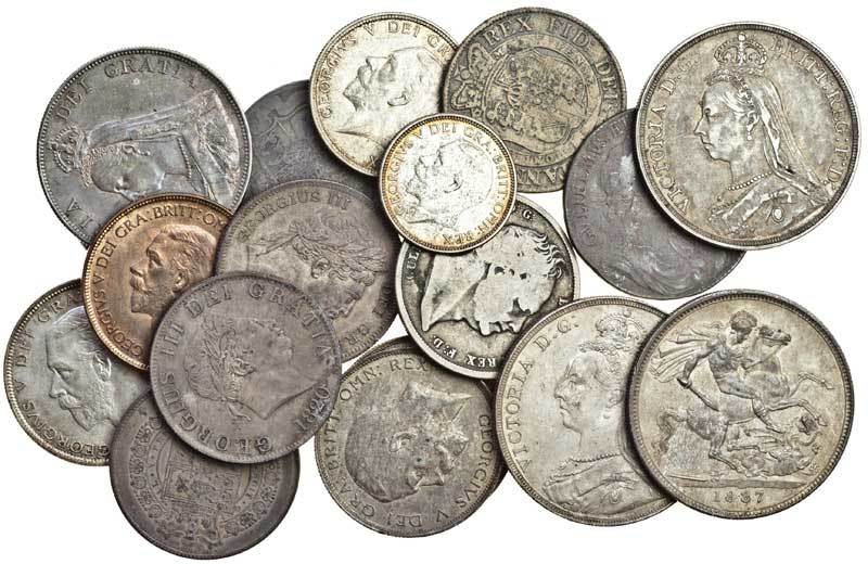 Miscellaneous silver coins (16), Crowns (3), 1887 (2), 1889, Double-Florin, 1887, Halfcrowns (10), 1689, first reverse, first V over A, 1816, 1820 (2), 1824, 1826, 1836, 1912, 1913, 1928, Florin, 1928, Shilling, 1928, and a Penny, 1928, very mixed, early coins fair to fine, some later coins very fine, the 1928 coins good extremely fine (17)