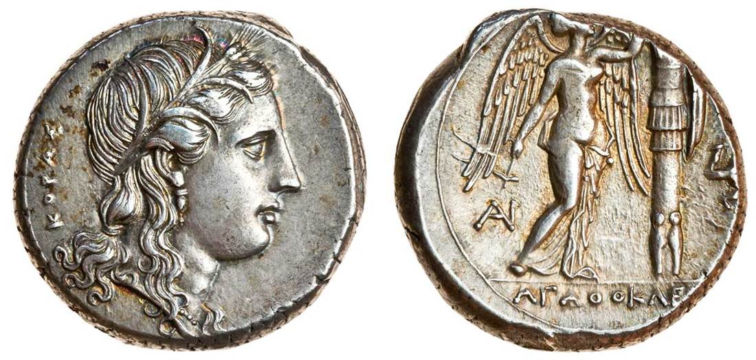 Sicily, Syracuse, Agathokles (317-289 BC), AR Tetradrachm, 16.73g, 305-295 BC, head of Kore right, wreathed with corn, KOPA, rev. AAOKE[O] in exergue, Nike standing right, erecting trophy of arms, a hammer in her right hand, triskeles on right, monogram on left (SNG Copenhagen 764; SNG ANS 664), reverse a little off centre, almost extremely fine