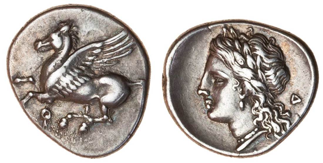 Corinth (c.350-300 BC), AR Drachm, 2.75g, Pegasos flying left, koppa below, rev. laureate head of Aphrodite left, behind (BMC 301), good very fine