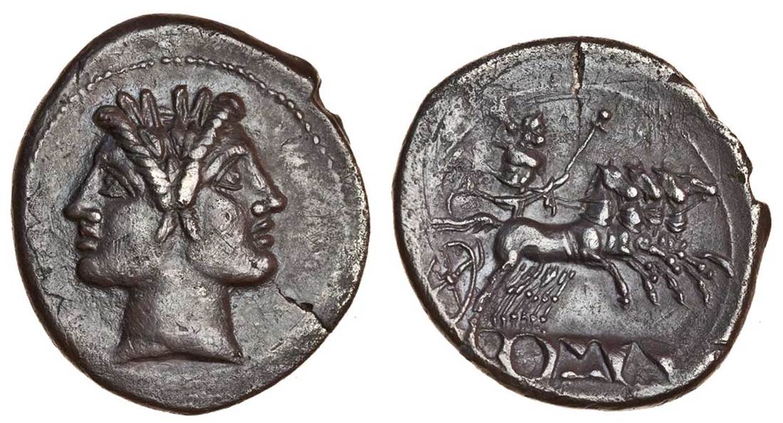Roman Republic (c.225-212 BC), AR Didrachm (or Quadrigatus), laureate Janiform heads of the Dioscuri, rev. ROMA incuse on tablet below Jupiter in quadriga right, hurling thunderbolt and holding sceptre (RRC 28/3; Sydenham 64; Hist. Num. 334), dark tone, minor flan-crack, very fine