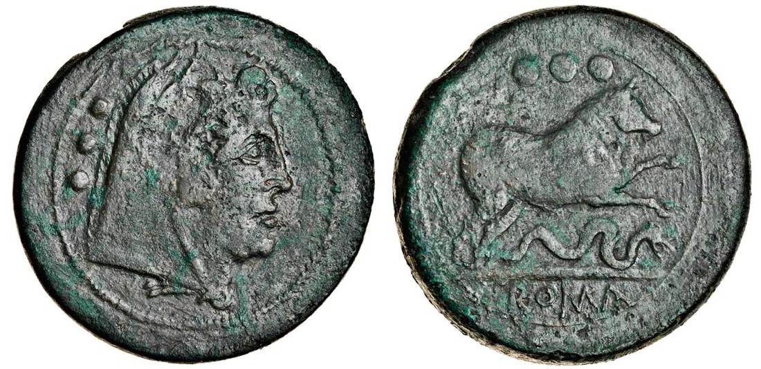 Roman Republic (c.217-215 BC), AE Quadrans, 38.80g, Rome, head of young Hercules right wearing boar-skin right, three pellets behind, rev. bull charging right, snake below, three pellets above, ROMA in exergue (RRC 39/2; BMC 116), almost very fine
