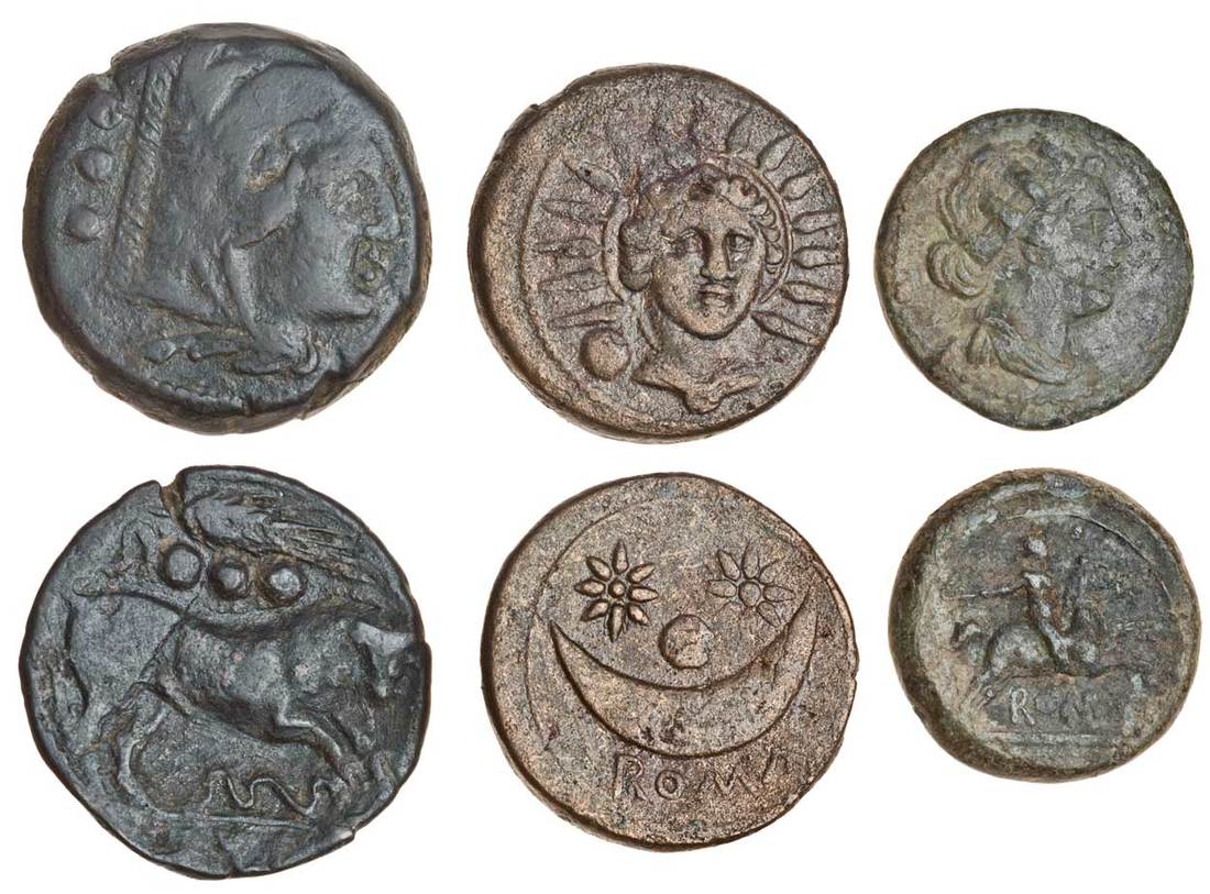 Roman Republic (c.211-210 BC), AE Quadrans, 12.25g, Sicily, head of young Hercules right wearing boar-skin right, three pellets behind, rev. bull charging right, snake below, three pellets and ear of corn above, ROMA in exergue (RRC 72/7; BMC 140), together with an Uncia, facing bust of Sol, pellet on left, rev. ROMA, crescent and two stars, pellet above (RRC 39/4; BMC 125), and a Semuncia, female bust right, wearing turreted crown, rev. ROMA below horseman galloping right (RRC 39/5; BMC 136), almost very fine (3)