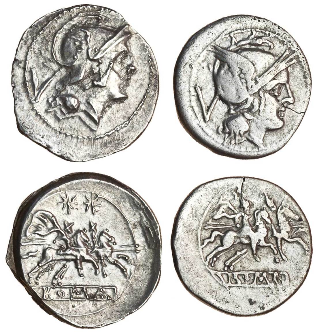 Roman Republic (from 211 BC), AR Quinarius, Rome, helmeted head of Roma right, V behind, rev. ROMA in linear frame below the Diosscuri on horseback right (RRC 44/6; Sydenham 169), very fine, and another similar, minor flan-crack, good fine (2)