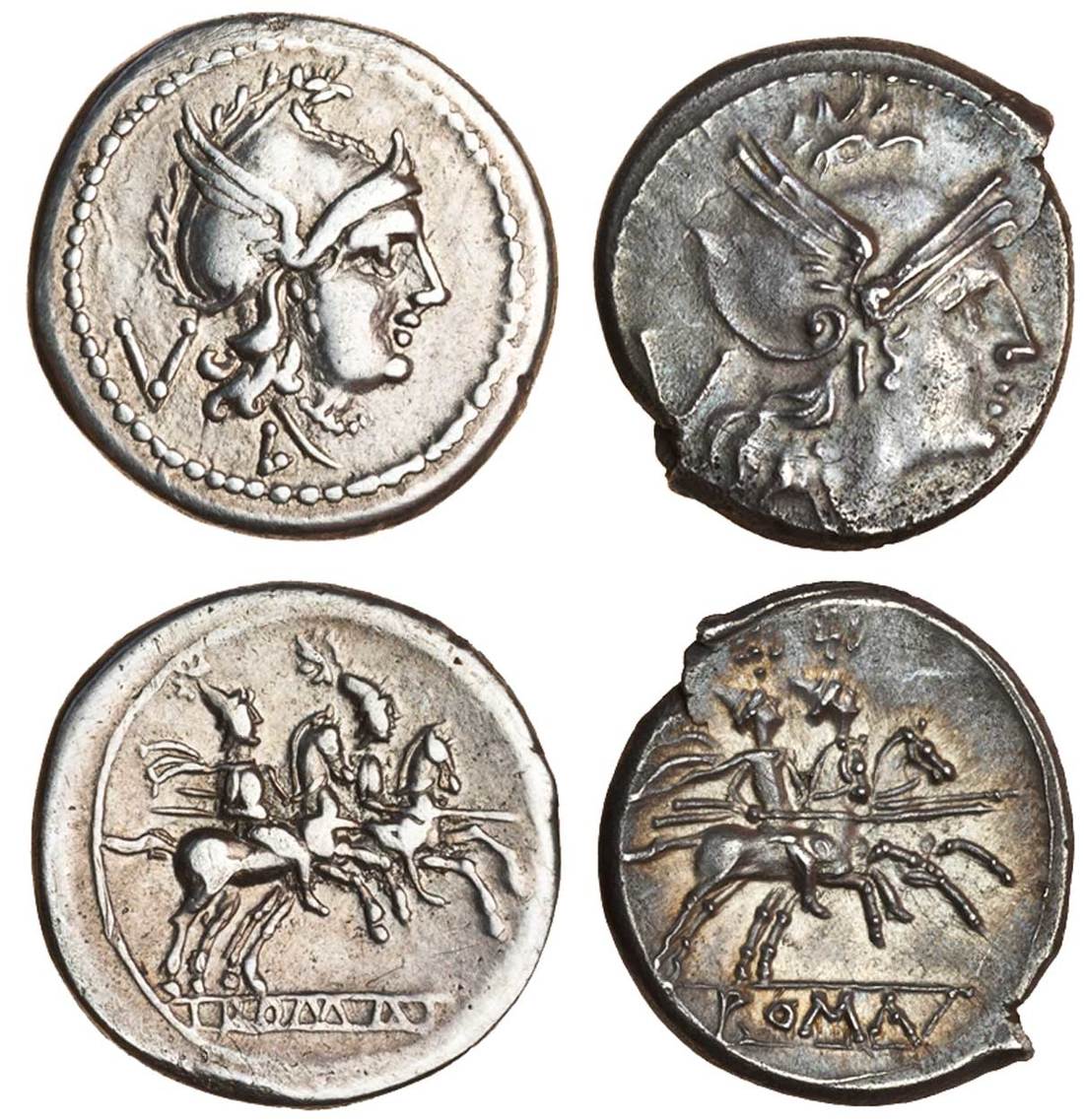 Roman Republic (214-212 BC), AR Quinarius, Luceria, head of Roma right, wearing Phrygian helmet, V behind, L below, rev. ROMA in linear frame below the Dioscuri riding right (RRC 98A/3: Sydenham 176a), very fine, together with another from Rome (after 211 BC), similar, but no L on obverse (RRC 44/6; Sydenham 169), extremely fine (2)