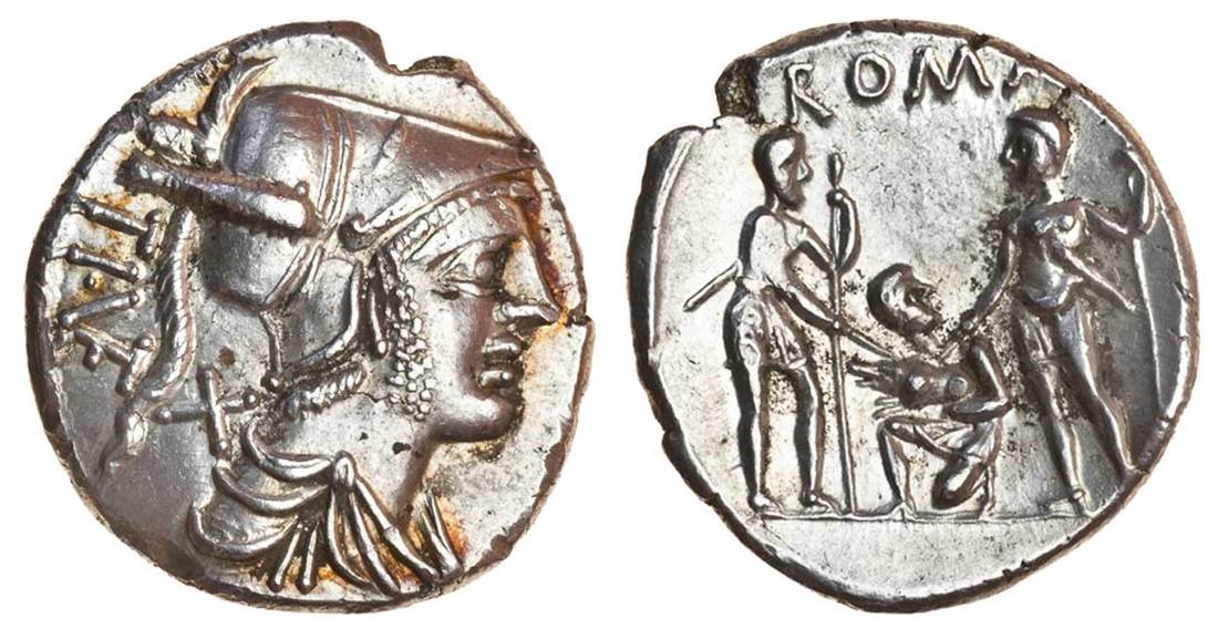 Ti. Veturius Gracchus (137 BC), AR Denarius, draped and helmeted bust of Mars right, TI VET (ligatured) behind, rev. ROMA above youth kneeling left between two soldiers, who touch with their swords a pig he holds in his arms (RRC 234/1; Sydenham 527), large flan slightly bent, extremely fine