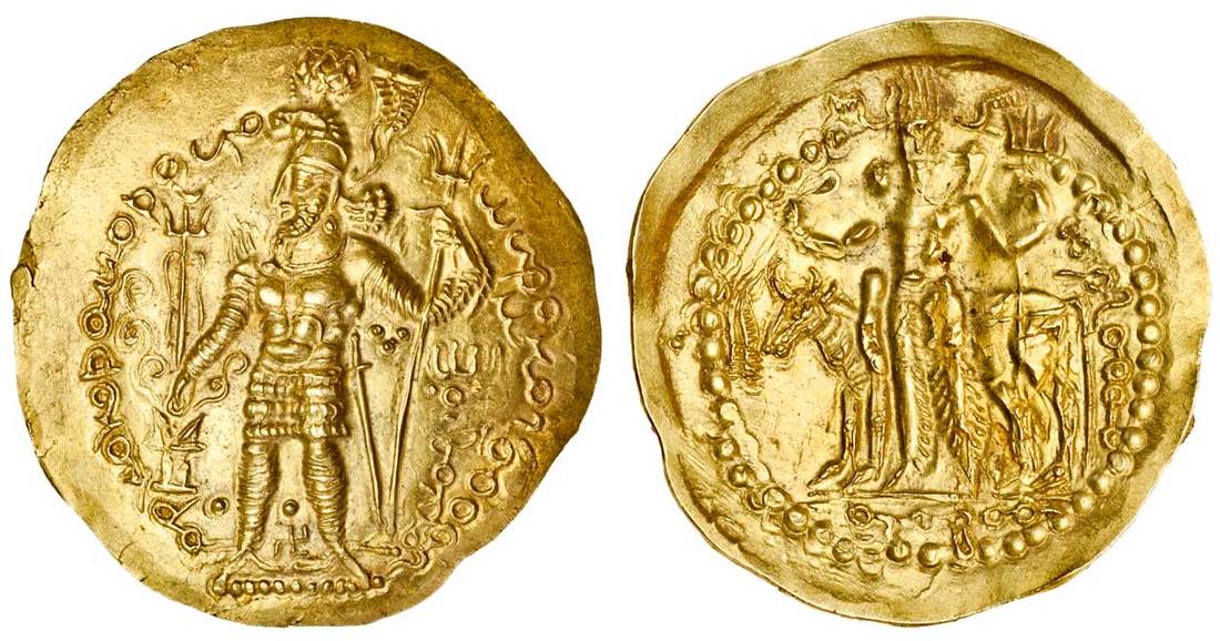 Kushano-Sasanian, Hormizd I (c.285-300 AD), scyphate AV Dinar, 7.85g, king standing left wearing lion-headed korymbos, making an offering at a fire altar, trident above, holding trident standard to right, with nandipada in right field and swastika between legs, rev. Siva standing with bull Nandi behind, holding trident and noose (Göbl 707; Alram 1412; cf. Sunrise 1018), extremely fine