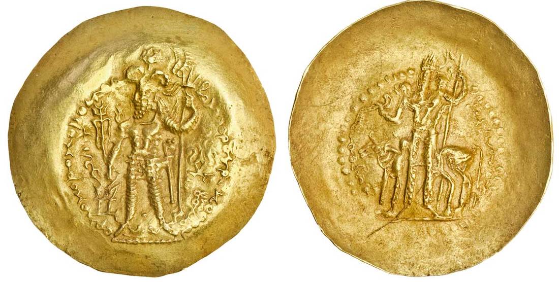Kushano-Sasanian, Vahram I, scyphate AV Dinar, 8.22g, king standing left wearing horned headdress making offerings at a fire altar, trident above, holding trident standard to right, with nandipada and six-petalled flower in right field, rev. Siva standing with bull Nandi behind, holding trident and noose (Göbl 715; Alram 1456; cf. Sunrise 1021), a little weakly struck, extremely fine