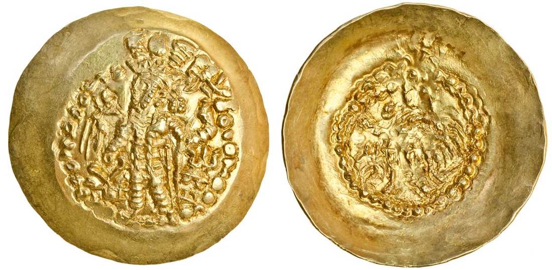 Kushano-Sasanian, Kidara (late 4th century), scyphate AV Dinar, 7.55g, stylised image of king standing left wearing korymbos with large ribbons, making offerings at a fire altar, holding a standard to right, with nandipada and swastika in right field, rev. Siva standing with bull Nandi behind, holding trident and noose (Göbl 735), reverse poorly struck as usual with this type, minor flan cracks, extremely fine