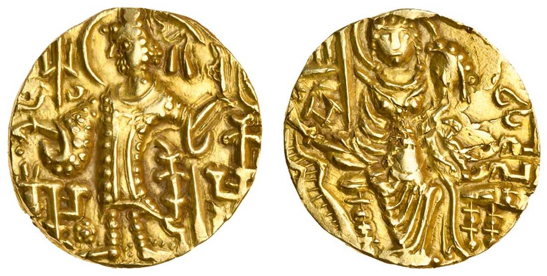 Kidarite, Kidara (late 4th century), AV Dinar, 7.84g, king standing left holding trident, kushana under left arm, kidara under right arm, kapan in right field, rev. Ardoksho seated facing (Göbl 615; cf.MAC 3618), good very fine