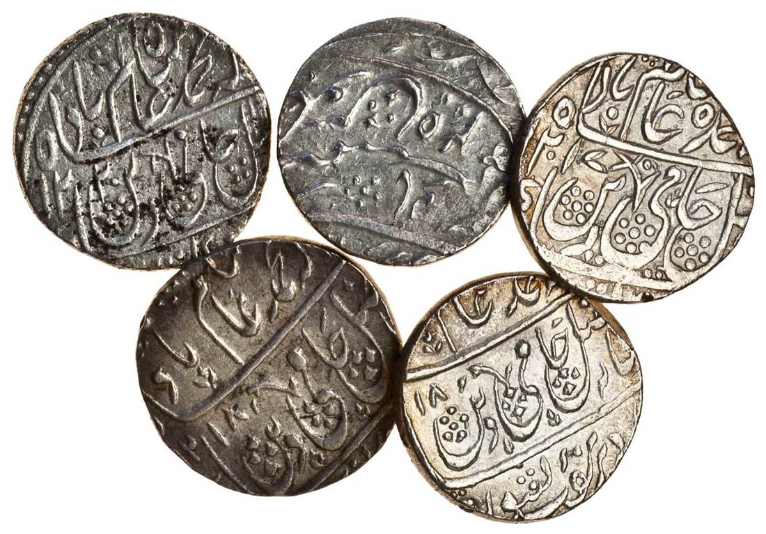 (x) India, East India Company, Bengal Presidency, Rupees (4), Saharanpur, in the name of Shah 'Alam II, AH1218, ry. 45 (3), two different reverse varieties, AH1220, ry. 47, Shah 'Alam, Rupee, AH1217 / 44, (KM. 675, listed under Mughals; Stevens 8.125, 8.127, 8.129), extremely fine and scarce (5)