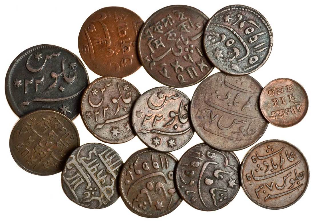 (x) India, Bengal Presidency, AE Coins (13), including issues of Prinsep's Coinage (1780-84), Half-Anna (Madosie), Eighth-Anna (Nim Fulus) (5), Sikka Pice (4), Trisuli Pice (2), Benares, Farrukhabad, milled Pie (Pr.191, 197, 198, 206, 209, 215, 312, 336; KM.25, 30, 57, 58, 65, 122, 123, 126), generally very fine (13)