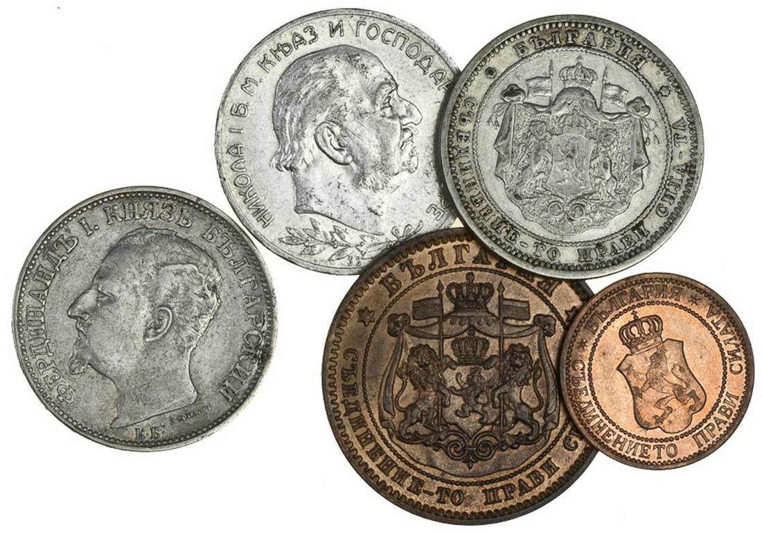 Bulgaria, Alexander I (1879-86), 2-Leva, 1882, AE 10-Stotinki, 1881, Ferdinand I (1887-1918), 2-Leva, 1891 kb, AE 2-Stotinki, 1912 (KM.3, 5, 14, 23.2), the silver very fine, copper about as struck, about uncirculated with lustre, Montenegro, Nicholas I (1860-1910), 2-Perpera, 1910 (KM.7), some scuffs to portrait, good very fine (5)