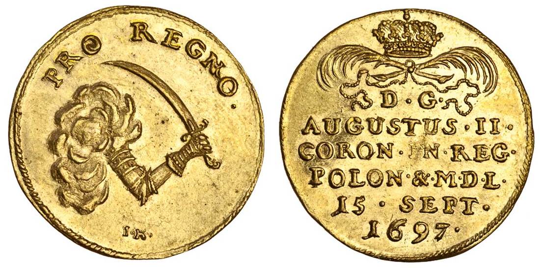 Poland - Saxony, Augustus III (1697-1733), Coronation Ducat, 3.46g, 1697, commemorating his election and coronation as King of Poland, Dresden mint, pro regno, arm issuing from cloud, holding Polish sabre, ik (for mint master Johann Kock) below, rev. legend in six lines d.g. augustus. ii. coron. in. reg. polon. & m.d.l. 15. sept. 1697., crown and crossed palms above (F.2830; HCz.2600; KM 695), extremely fine