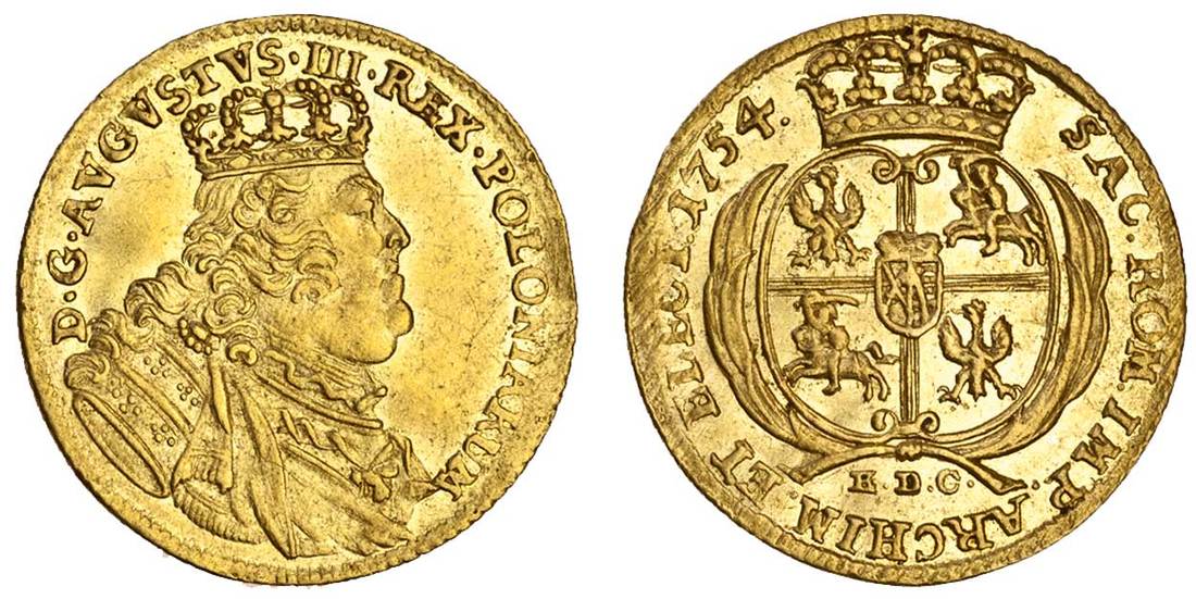 Poland - Saxony, Friedrich August II (Augustus III) (1733-63), Ducat, 3.47g, 1754, crowned, draped and cuirassed bust right, rev. crowned shield, e.d.c. below (F.2855; KM 916), wavy flan, extremely fine
