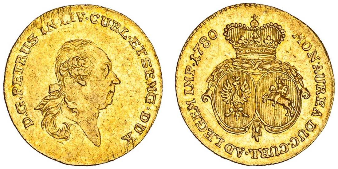 Poland, Duchy of Courland, Peter Biron (1769-95), Ducat, 3.46g, 1780, head right, rev. crowned shields (F.4; HCz.3409 - R3), good very fine