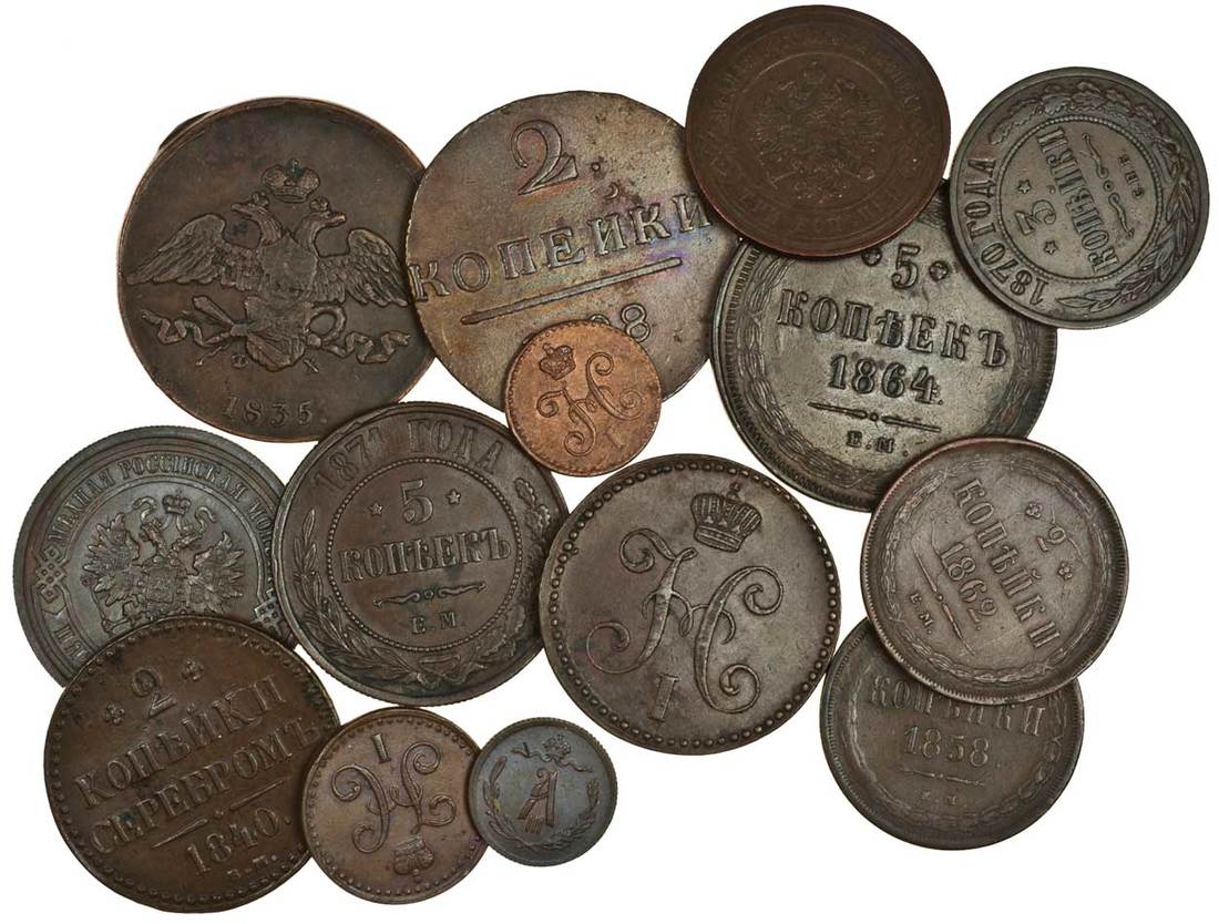 Russia, AE 5-Kopeks (4), 1835 em, 1864 em, 1871 em, 1911, 3-Kopeks (2), 1867, 1870, 2-Kopeks (5), 1798, 1840, 1841, 1858, 1862, all em, ½-Kopek (2), 1841, 1893, ¼-Kopek, 1841 (KM.4a.1, 6a, 11.1, 12.1, 12.2, 30, 95.3, 140.1, 142.2, 143.4, 145.1, 150.1), very fine to extremely fine (14)