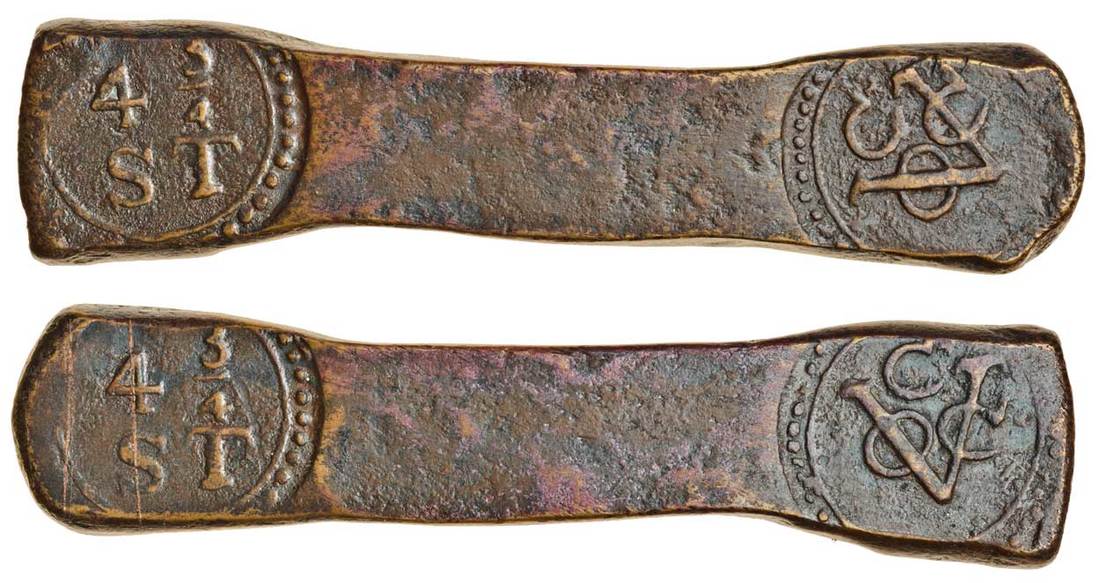 (x) Sri Lanka / Ceylon, Dutch East India Company (VOC), AE 4¾ Stuivers (Bonk Bar), 66.09g, Colombo, undated, stamped both sides with VOC monogram and 'C' above to right and value to left (Codrington 133.1; MNI 2184; Scholten 1295; KM 32), very fine, scarce