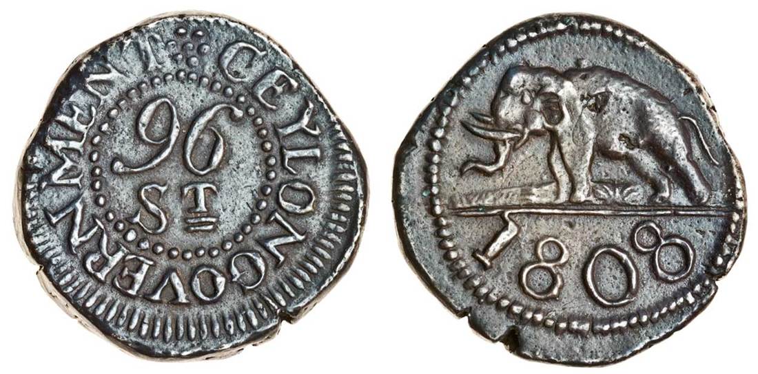 (x) Sri Lanka (Ceylon), British Colonial, 96-Stivers, 1808, legend ceylon government around denomination, rev. elephant standing left above date (KM.79; Pr.1), flan a little irregular, extremely fine, scarce in this condition