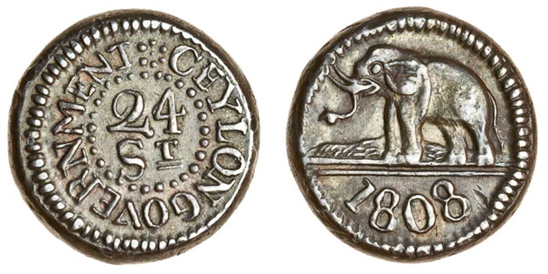 (x) Sri Lanka (Ceylon), British Colonial, 24-Stivers, 1808, legend ceylon government around denomination, rev. elephant standing left above date (KM.76; Pr.17), attractive and well struck, extremely fine