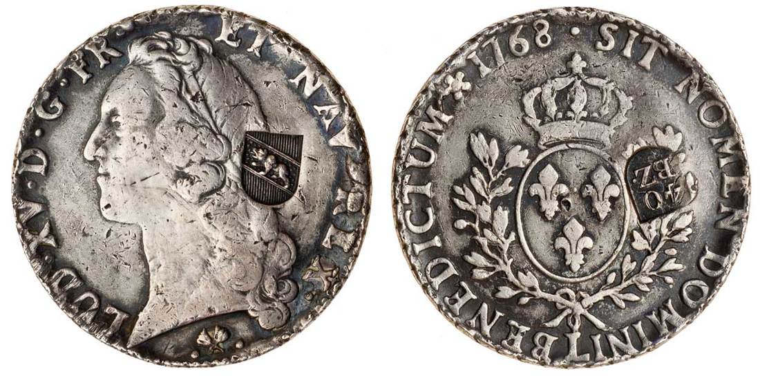 Switzerland, Bern, 40-Batzen, counterstamp on French ecu of 1769 L (Bayonne), city arms, rev. value (HMZ; KM 180), obverse of host coin smoothed, countermarks very fine